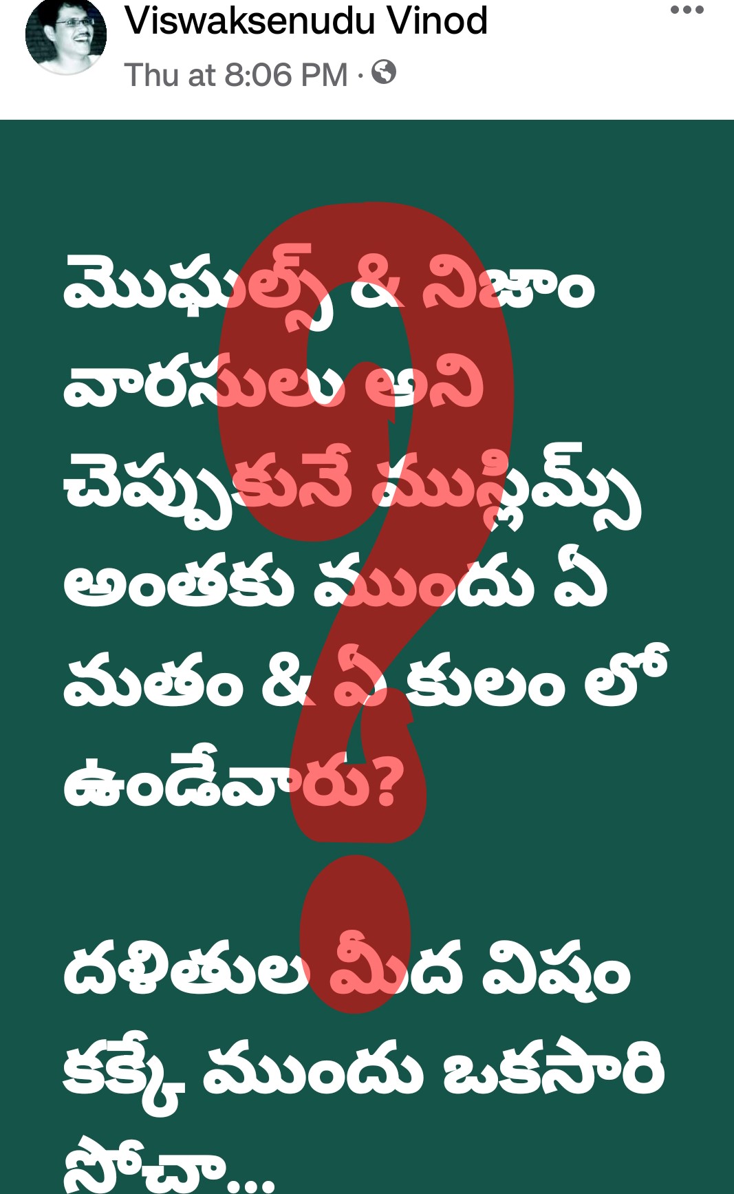 వీరి ముందు ఎవడో సన్నాసి “మేము మొఘల్స్ & నిజామ్స్ వారసులం” అని చెప్పుకున్నాడంట. దీనితో ఇస్లామోఫోబియా అనే మెంటల్ ప్రాబ్లం ఆల్రెడీ ఉండటం మూలానా పాపం తట్టుకోలేక లాజిక్కులన్నీ ప్రక్కనపెట్టేసి మొత్తం ముస్లిం సమాజమంతా మొఘల్స్ & నిజామ్స్ వారసులమని చెప్పుకుంటున్నారన్నట్టు ఫీలైపోయి ఈ క్రింది పోస్టు పెట్టుకుని నాస్తికానందాన్ని పొందారు.