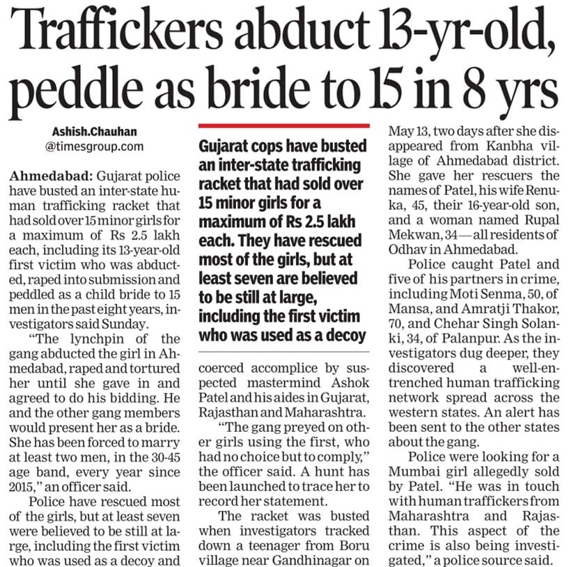 గత ఏమిదేళ్లలో గుజరాత్ లోని అహ్మదాబాద్ ఇతర ప్రాంతాల నుండి 15 మంది మైనర్ అమ్మాయిలు పెళ్లి కూతుళ్ల రూపంలో ఒకొక్కరూ రెండున్నర లక్షల రూపాయలకు బలవంతంగా అమ్మబడ్డారు. వీరిలో 13 ఏళ్ల అమ్మాయి అయితే 15 మందికి అమ్మబడి అతి దారుణంగా సామూహిక అత్యాచారానికి, అనేక హింసలకు గురికావటం జరిగింది.