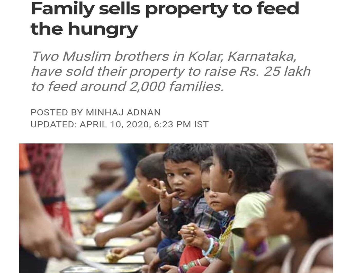 కరోనా కరాళ నృత్యం చేస్తున్న వేళ రెక్కాడితే గానీ డొక్కాడని ఎందరో పేదల పైకి చెప్పుకోలేని ఆకలి బాధలు వర్ణనాతీతం. ఇలాంటి వారి ఆకలి బాధను చూసి దేశవ్యాప్తంగా ఎందరో హిందూ, ముస్లిములు మతాలకతీతంగా తమకు ఉన్న వనరుల పరిధిలో సేవలు చేస్తున్నారు. అన్నిటికంటే ముఖ్యంగా చెప్పుకోతగ్గ విషయం కర్ణాటక, కోలార్ లో ఓ ఇద్దరు ముస్లిం యువకులు తాము ఉన్న ప్రాంతంలో దాదాపు 2000 పేద కుటుంబాలు ఎదుర్కుంటున్న ఆకలి బాధలు చూసి తట్టుకోలేక తమకు ఉన్న 25 లక్షల ఆస్తిని అమ్మేసి, వారికి ఇంట్లో కావలసిన బియ్యం, కిరాణా సామాన్లే కాక సానిటైసర్లు, మాస్కూలు కూడా కొనిచ్చి వారి ఆరోగ్యమే కాక వారి ఆకలి బాధలు తీర్చే పని చేస్తున్నారు. పోనీ, వారేమన్నా కోటీశ్వరులా అంటే అదీ కాదు కేవలం మధ్యతరగతి యువకులు మాత్రమే!