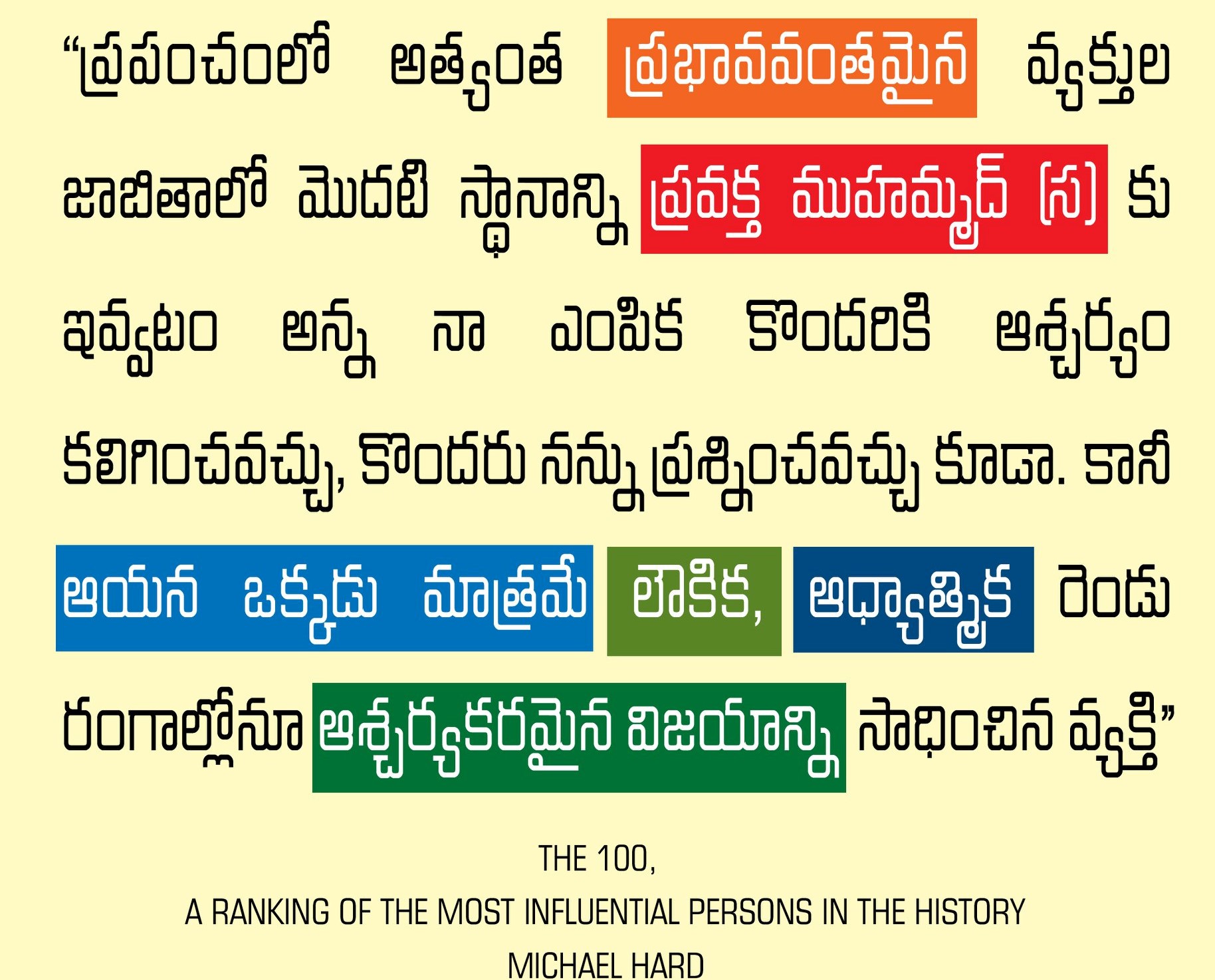 ”చరిత్రలో మానవాళిని ప్రభావితం చేసిన వందమంది జాబితాలో మొట్ట మొదటి స్థానం ప్రవక్త ముహమ్మద్కు ఇవ్వటం అన్న నా ఎంపిక చాలా మందికి ఆశ్చర్యానికి గురిచెయ్యవచ్చు కానీ ఆయన మాత్రమే చరిత్రలో ఆధ్యాత్మికంగానూ, భౌతికంగానూ గొప్ప విజయం సాధించిన ఏకైక వ్యక్తి”