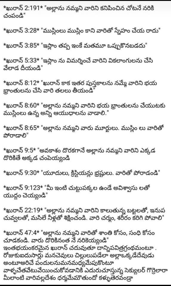 ఈ మధ్యకాలంలో వాట్స్ యాప్ గ్రూపుల్లో విపరీతంగా షేర్ చెయ్యబడుతున్నదే ఈ క్రింది పోస్టు. చివర్లో “వాళ్ళ చేత వేటు వేయించుకోవటానికి ఎదురు చూస్తున్న సెక్యులర్ గొర్రెల్లారా మీ లాంటి వారి వల్లే దేశం ధర్మమేమవుతుందో కళ్ళు తెరవండ్రా” అని రాయటాన్ని బట్టి ఇదొక మతోన్మాద తీవ్రవాద గ్రూపు ద్వారా సామాన్య హిందూ ప్రజానీకాన్ని ముస్లిములకు వ్యతిరేకంగా రెచ్చగొట్టి సోదరభావాన్ని దెబ్బ తీయటానికి తయారు చెయ్యబడిన చిల్లర రాతలతో నిండిన పోస్టని ఇట్టే అర్థమైపోతుంది. దాని కోసం ఖురాన్ వాక్యాల సందర్భాన్ని తప్పించి వారు ఎంతగా వక్రీకరించారో ఒకసారి ఈ క్రింది గమనించగలరు.