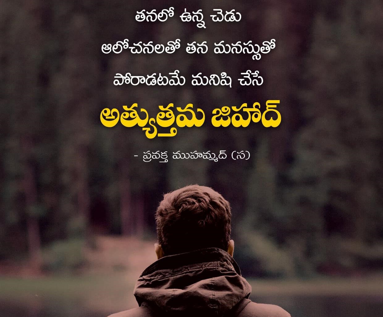 “ఏ వ్యక్తి అయితే దైవం కొరకు తన హృదయంలో మెదిలే చెడులతో పోరాడతాడో అతడే వాస్తవంగా జిహాద్ చేసిన వాడు” – సహీహ్, ఇబ్నె హిబ్బన్ 4862