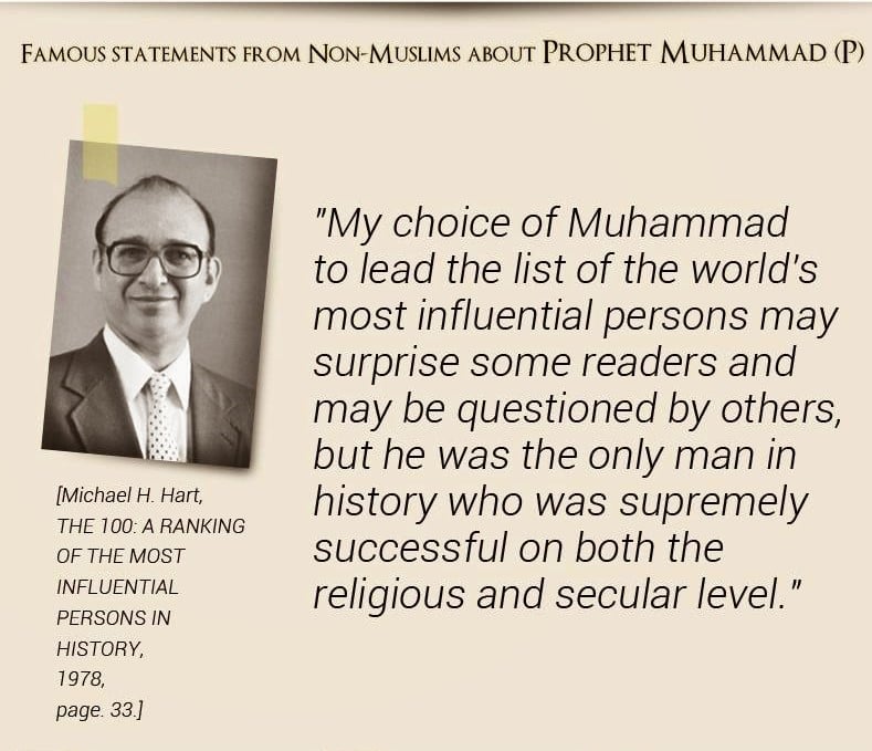 ”చరిత్రలో మానవాళిని ప్రభావితం చేసిన వందమంది జాబితాలో మొట్ట మొదటి స్థానం ప్రవక్త ముహమ్మద్కు ఇవ్వటం అన్న నా ఎంపిక చాలా మందికి ఆశ్చర్యానికి గురిచెయ్యవచ్చు కానీ ఆయన మాత్రమే చరిత్రలో ఆధ్యాత్మికంగానూ, భౌతికంగానూ గొప్ప విజయం సాధించిన ఏకైక వ్యక్తి”