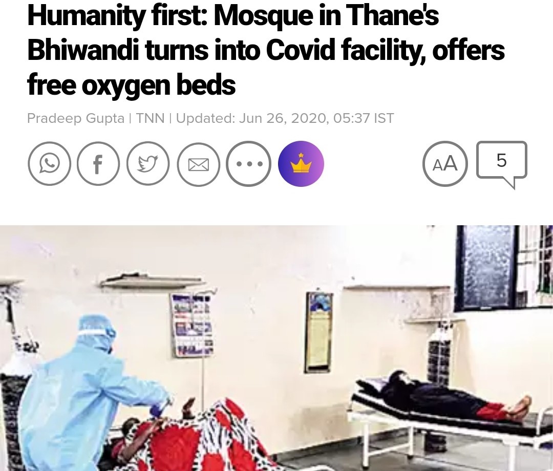 1. మహారాష్ట్ర లోని ఔరంగాబాద్ లోని ‘జామా మసీదు’లోని మదర్సా ను 100 మందికి సరిపడా పడకలు సిద్ధం చేసి క్వారంటైన్ సెంటర్ గా మార్చి ఎందరో కోవిడ్ పేషంట్ల సేవకు వినియోగించటం జరుగుతుంది.
