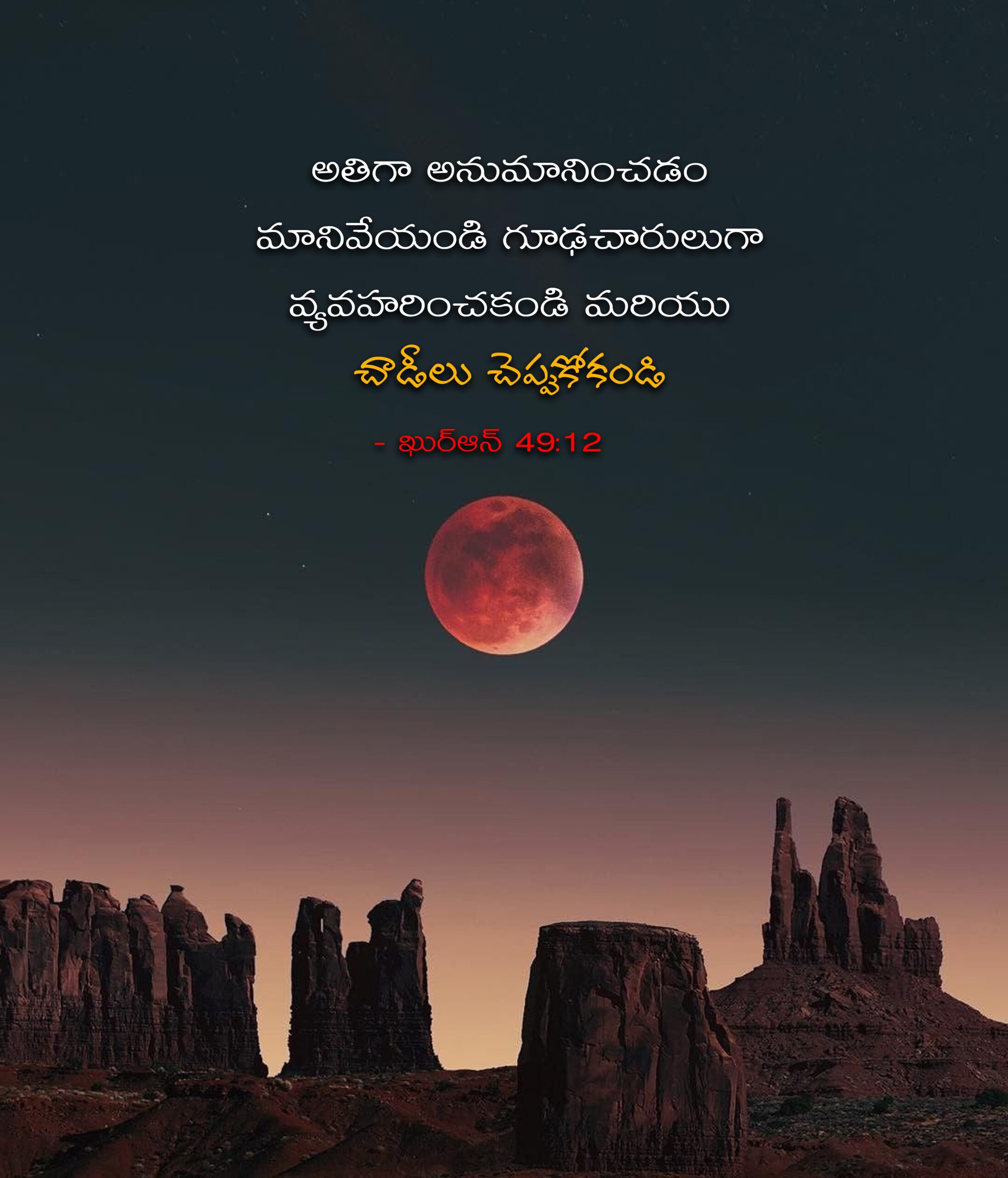 ఇస్లాం ఉన్నత వ్యక్తిత్వ నిర్మాణాన్ని అభిలషిస్తుంది. ఒక సుందర సమాజాన్ని నిర్మించాలని కోరుకుంటుంది. ఇతరులపై అతిగా అనుమానపడటం, గూఢచారుగా వ్యవహరించటం లేదా చాడీలు చెప్పటం అన్నవి అత్యంత అసహ్యకరమైన విషయాలు. ఇలాంటి పనులు చెయ్యటం చనిపోయిన స్వంత సోదరుని మాంసం తినటమంత అసహ్యకరమైన విషయమని ఖురాన్ చెబుతుంది.